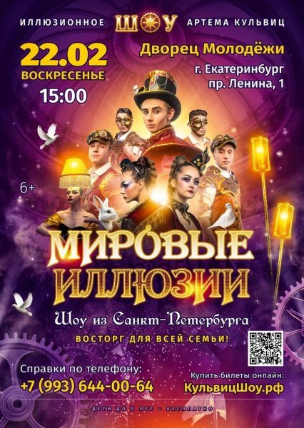 Один из лучших иллюзионистов России в жанре больших иллюзий Артём Кульвиц, представляет новое шоу - “Мировые Иллюзии”, захватывающее иллюзионное шоу с увлекательным сюжетом, это настоящий симбиоз волшебства, танца, музыки и красоты.