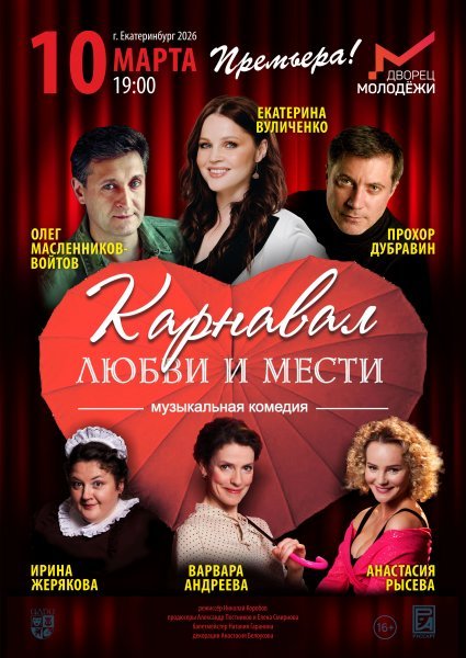 Увидеть такой уникальный актёрский состав на одной сцене в Екатеринбурге можно будет 10 марта 2026 г. на премьере музыкальной комедии «Карнавал любви и мести» во Дворце Молодёжи.